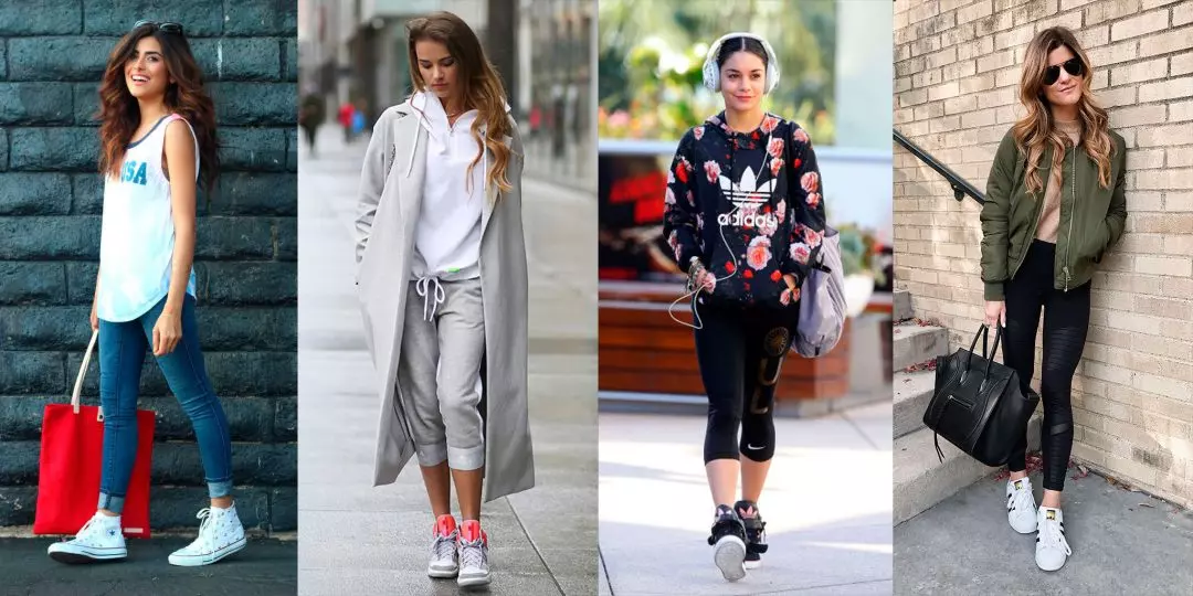Спорт-шик — сочетание футболок с лодочками, деловыми брюками, бомберов с мини-юбками и высокими каблуками. Самая популярная комбинация — длинное платье и кроссовки.