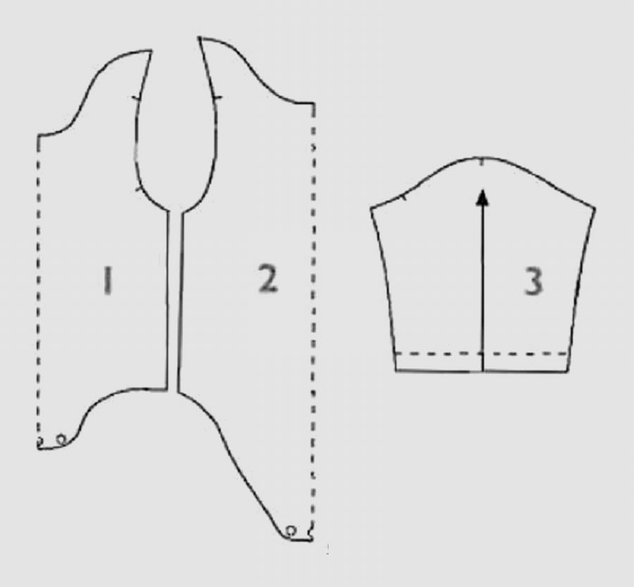 По всем сторонам деталей добавьте припуски на швы по 0,7 см, по низу спинки и переда в области застежки — 1,5 см.