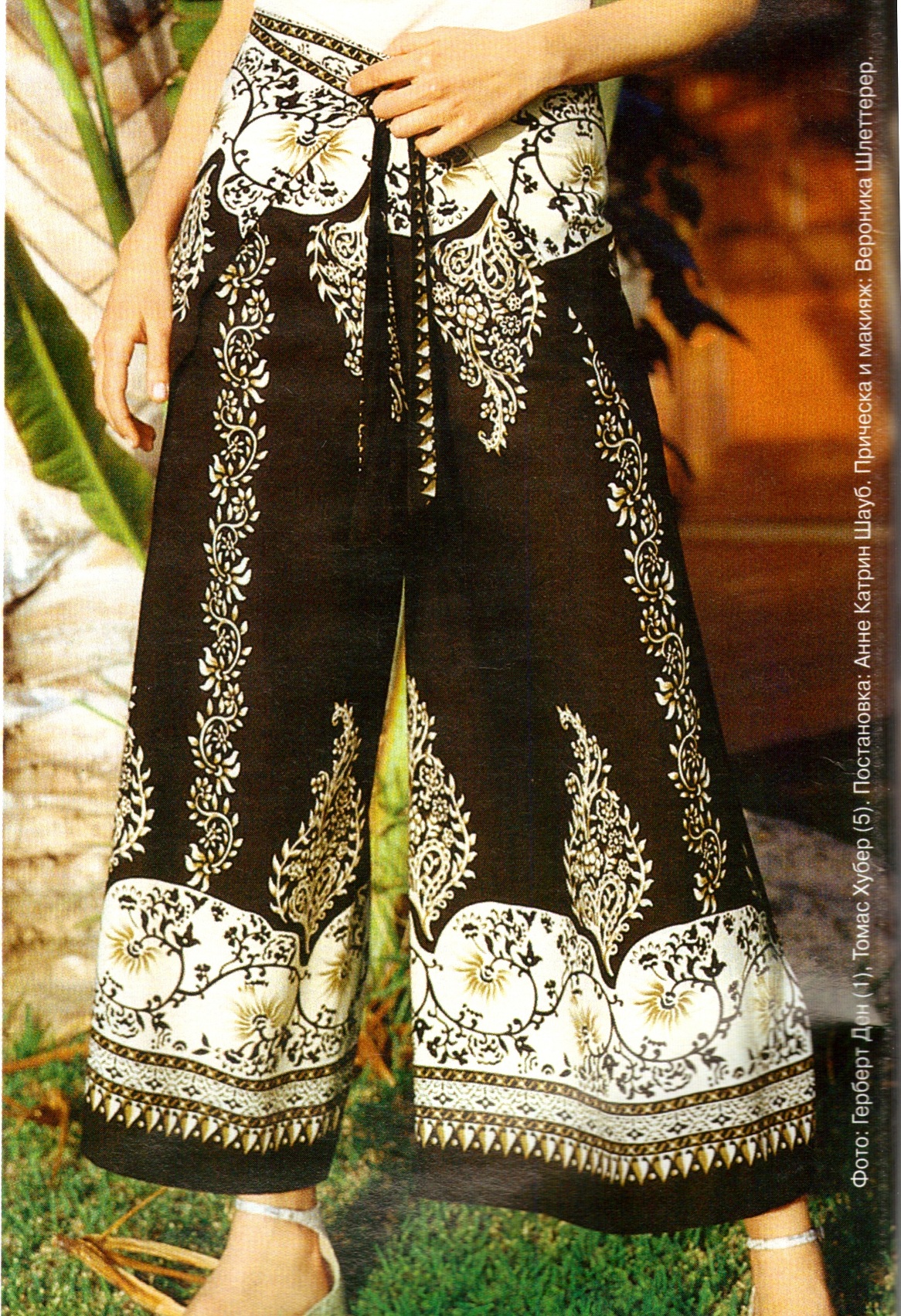 Секрет успеха этих брюк в искусной драпировке. Вам не составит особого труда превратить отрез мягкой струящейся ткани с декоративным набивным рисунком в сногшибательные брюки с запахом