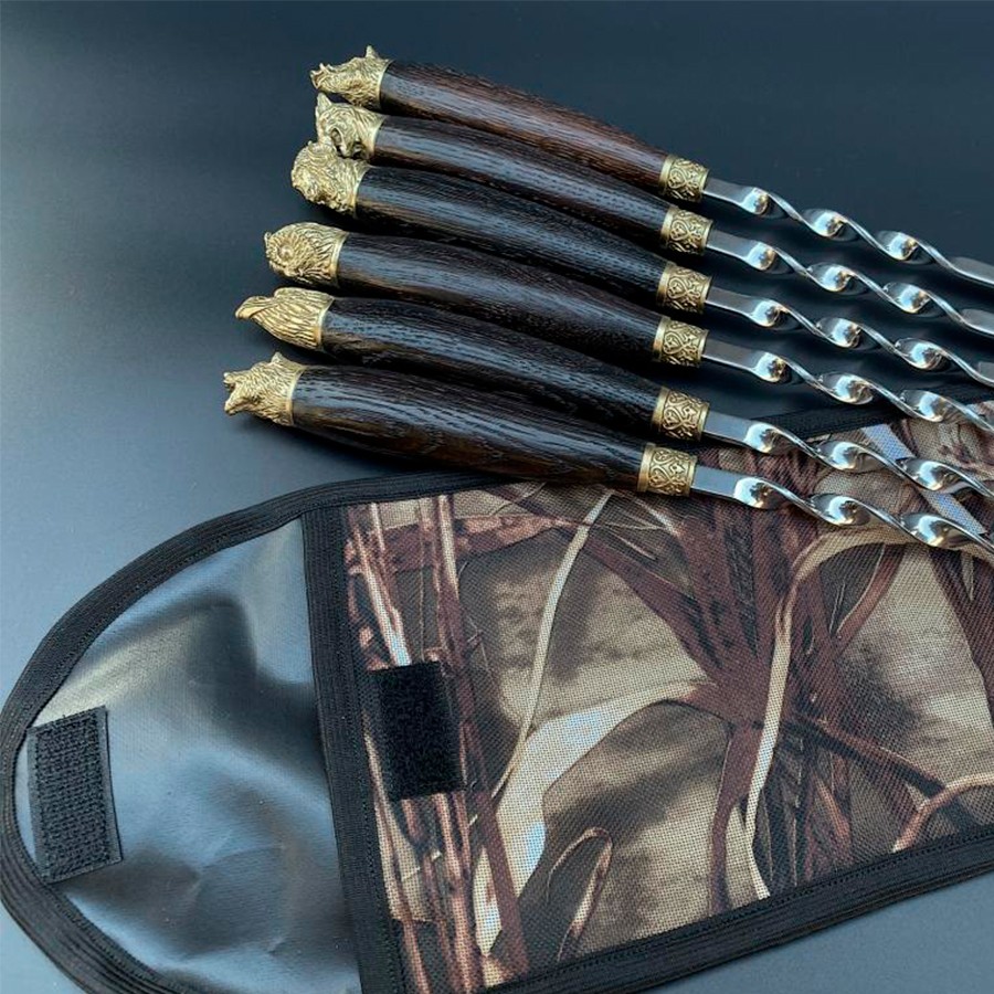 Небольшой, но стильный чехол из натуральной кожи, выполненный в стиле колчана. В нем шампуры будут храниться в полуоткрытом виде, что, к сожалению, не всегда актуально при выездах на природу. При этом подобный аксессуар станет отличным дополнением к подарочным шампурам.