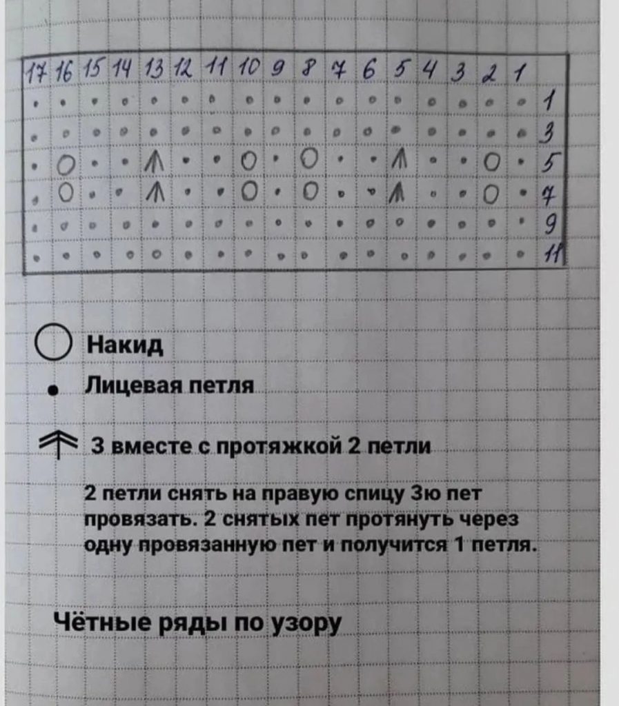 Затем вязать по кругу лиц. гладью 17 см. После сделать 3 ряда по схеме рисунка (5-й, 6-й, 7-й) ряды.