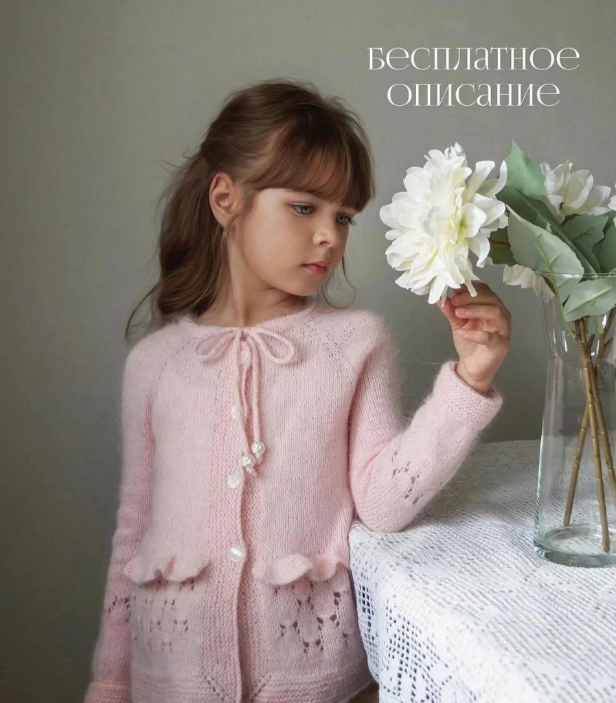 Такая нежная кофточка подойдёт для девочки возрастом от трех до пяти лет. На рост 96-104 см., объем груди 48-52 см.