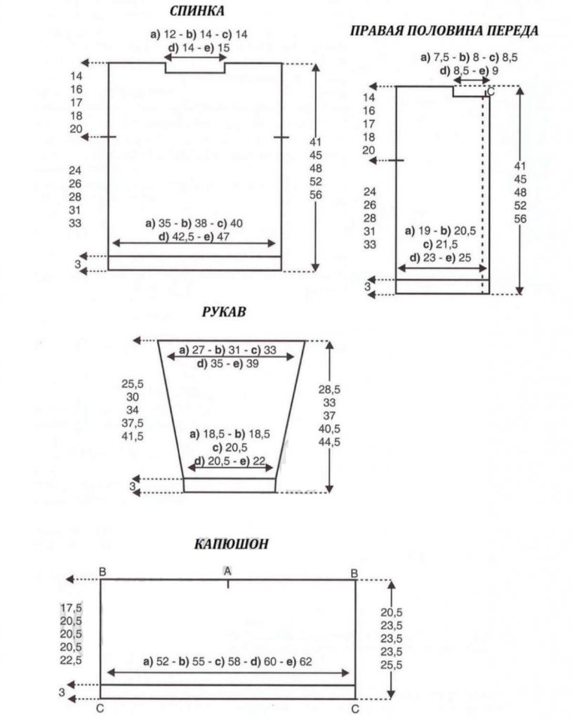 Набираем на спицы: a) 49, b) 52, c) 54, d) 56, e) 58 п. и вяжем 3 см. (4 р.) платочной вязкой, далее – лиц. гладь. На расстоянии: a) 20,5 см., b),c),d) 23,5, e) 25,5 см. от начала вязания все п. закрываем. Вязание детской кофты окончено.