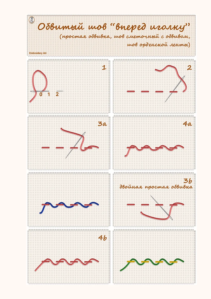Первый стежок делаем так, чтобы закрепить нить, все последующие показаны на фото ниже.