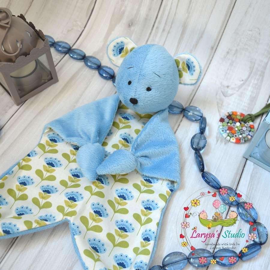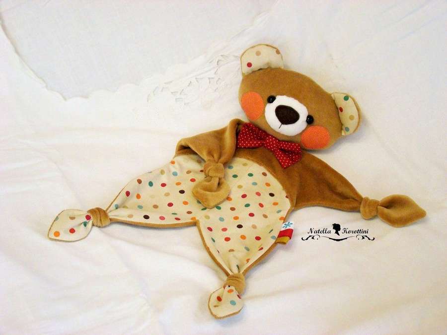 Отличная идея представлена на фото ниже. С помощью пришитых к лапкам липучек вы подарите ребенку возможность поиграть с комфортером.