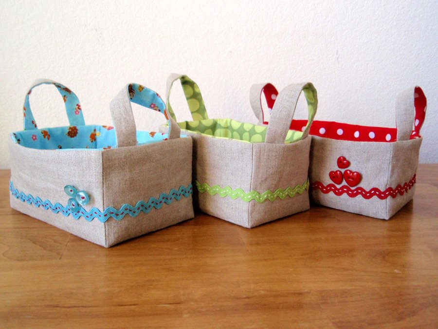 Классно и очень необычно смотрится еще один вариант корзины с зайчатами, причем материал вы можете взять любой, хоть хлопчатобумажную ткань, хоть фетр и даже любые ненужные лоскутки.