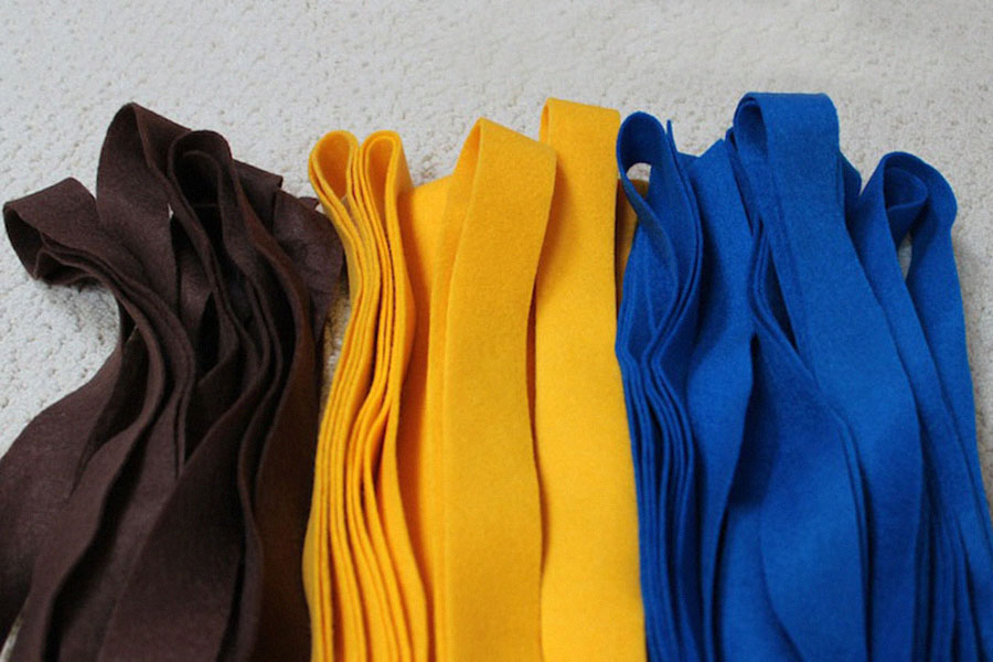 1. Нарежьте полосы по 3 сантиметра шириной. Длина каждой полосы — 180 сантиметров. Здесь используется 14 основных полос (по 7 жёлтого и синего цвета) и 5 дополнительных коричневого цвета. Каждую полосу сложите пополам по длине.