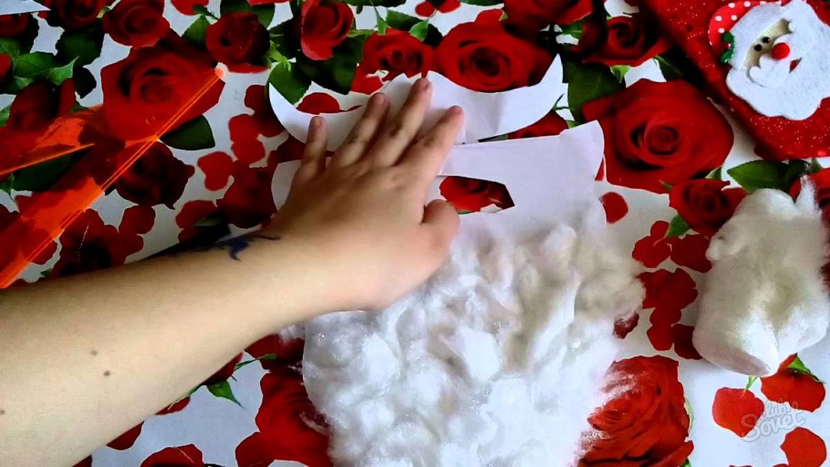 Сложите марлю в три слоя и вырежьте из нее прямоугольник, шириной от уха до уха, который будет закрывать подбородок и шею. Сделайте дырочку для рта, края марли обметайте и пришивайте резинку. Из шерстяных ниток поделайте пучки, нитки по три. Перевяжите их ниткой пополам и пришейте к марле, и так обшейте всю марлю. Для усов нужно пришить такой пучок ниток горизонтально. Как видите, совсем не сложно, это простые новогодние костюмы своими руками.