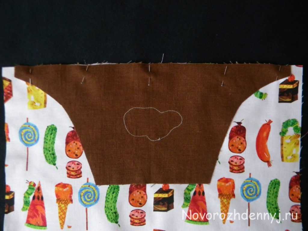Сначала декорируйте грудку: расположите на ней выкроенный элемент ткани с рисунком, зафиксируйте портняжной булавкой. Затем ручным наметочным швом закрепите края аппликации, а булавку выньте.
