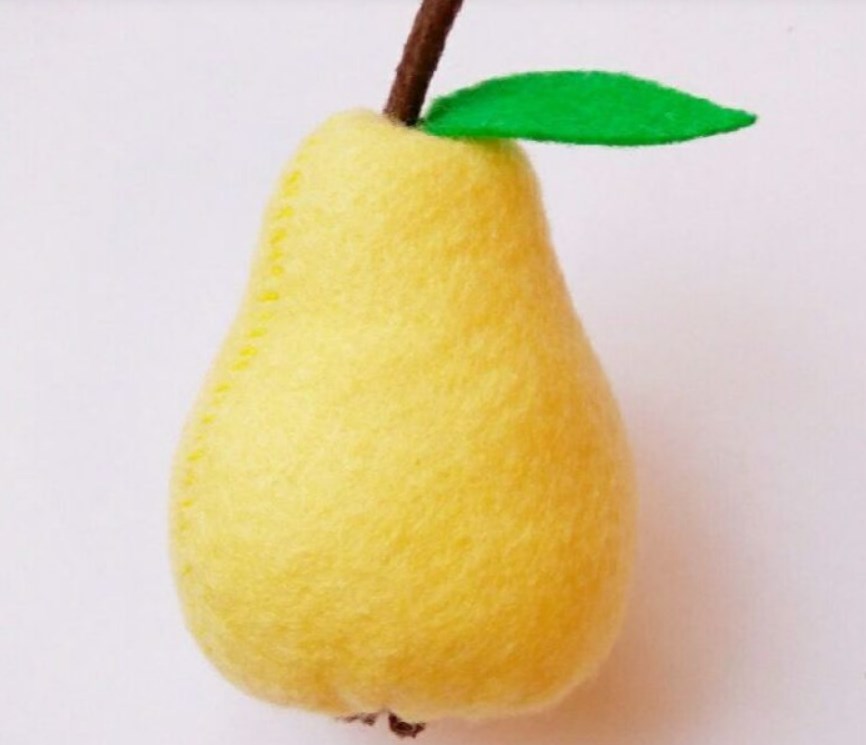 Продеваем иглу сквозь центральную ось игольницы, слегка стягиваем. Повторяем несколько раз, создавая небольшое углубление для плодоножки и чашелистика. Вшиваем их в грушу. К плодоножке пришиваем листик.