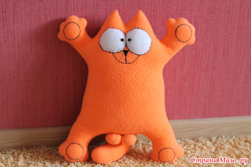 Выворачиваем хвостик и кота на лицевую сторону через отверстия, которые мы оставили ранее, набиваем их холлофайбером, затем зашиваем дырочки потайными стежками.