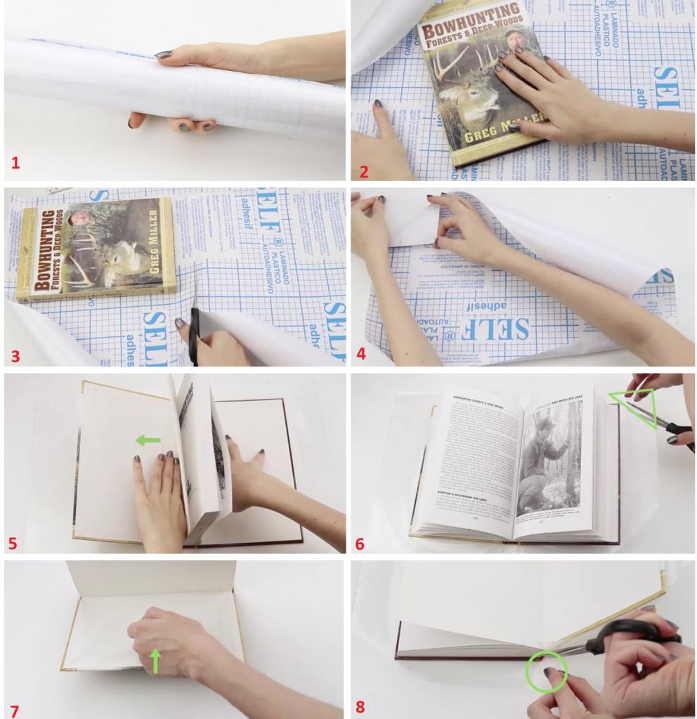 - Если используется клейкая пленка, с нее удаляют защитный слой и строго по центру размещают книгу.