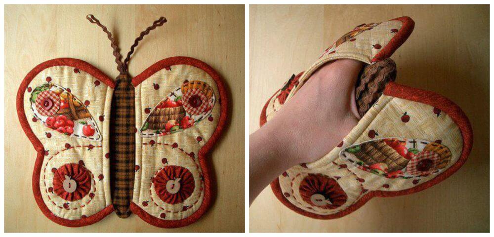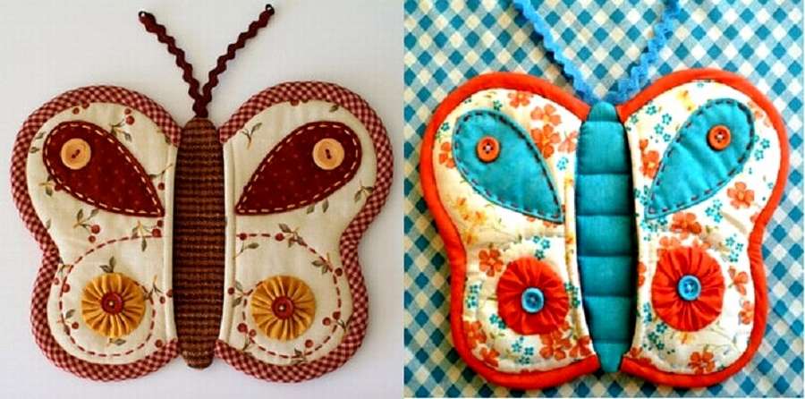 Прихватки бабочки сшиты своими руками в разных техниках, из различных материалов.