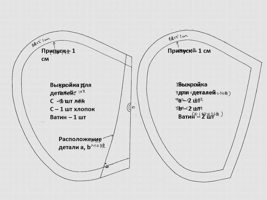 - Перенесите выкройку на основную ткань и утеплитель, оставляя по краям на припуски 1 см. Изготовьте две наружные детали и две детали внутреннего слоя (всего 4 шт);