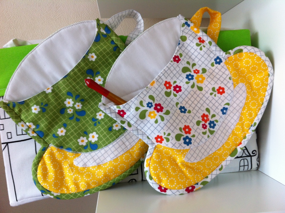 А следующие прихватки в форме чайников можно использовать и по основному предназначению, и как подставку под горячее.