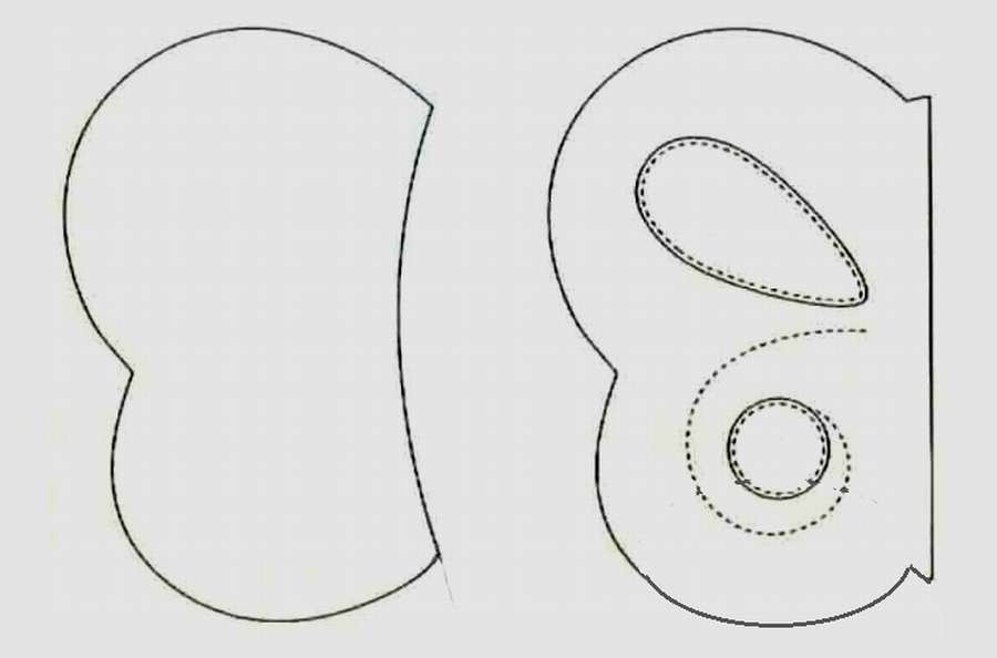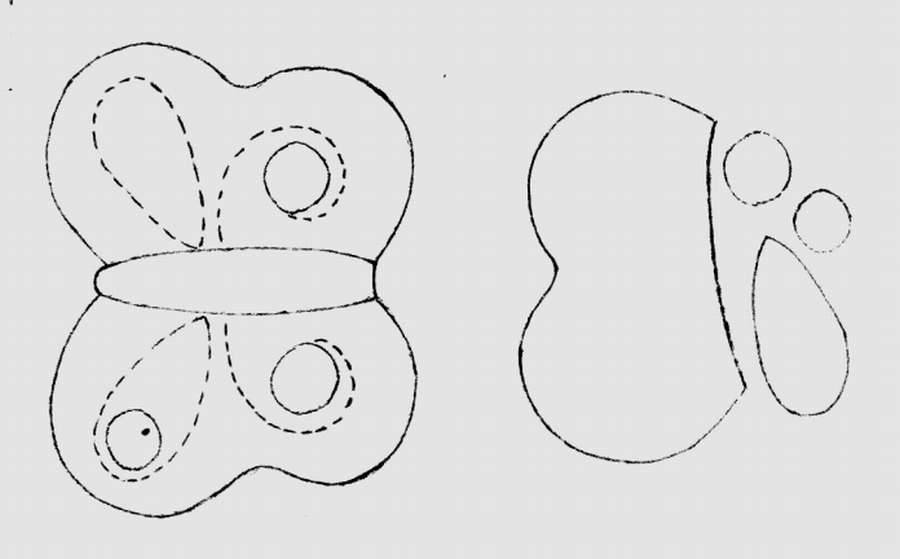 Выкройка деталей прихватки бабочки. Выкройка прикладывается к сложенной вдвое материи с ватином между слоями, всё скалывается булавками, так начинающим легче вырезать.