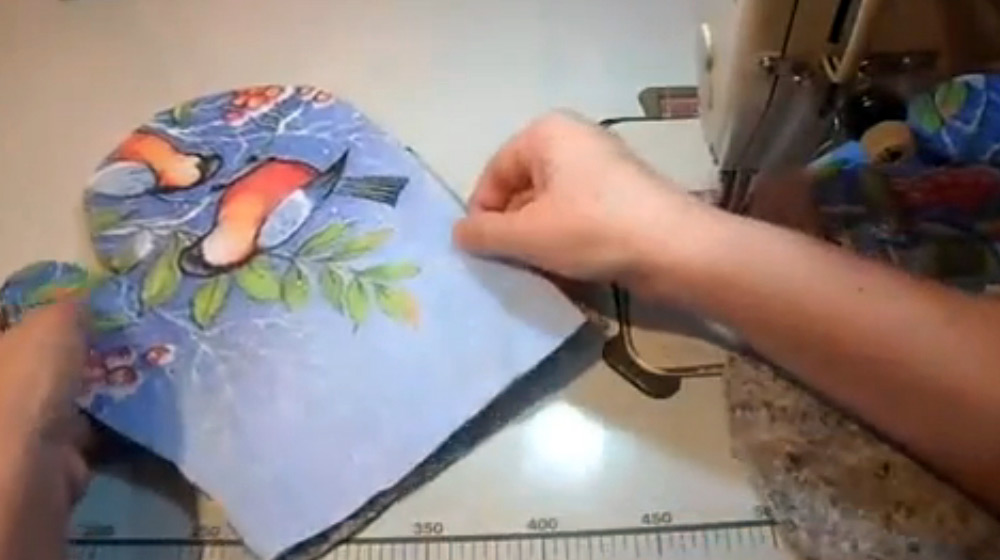 - Перекладываете две части прихватки лицом в лицо и пришиваете их по краям швом примерно 1 см от края.