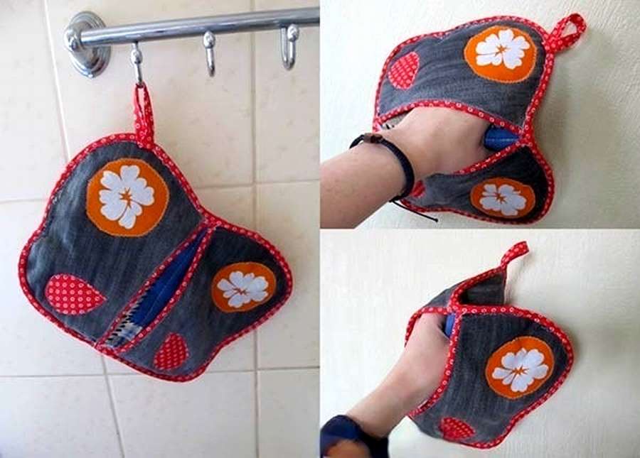 Прихватку для кухни из старых джинсов автор назвал «Удивительная бабочка». Подобный же аксессуар можно сделать из фетра, тогда прихватка бабочка будет выполнять чисто декоративную функцию. Зато сшить ее можно без швейной машинки, вручную.