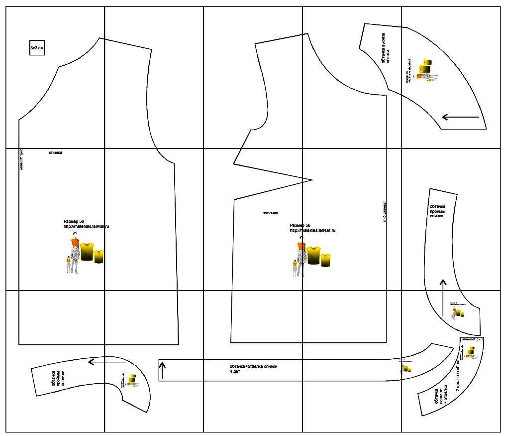 Намечаем вертикальные линии защипов, увеличиваем полочку на нужный размер (каждый защип равен 0,5 см). Корректируем по желанию длину деталей переда и спинки.