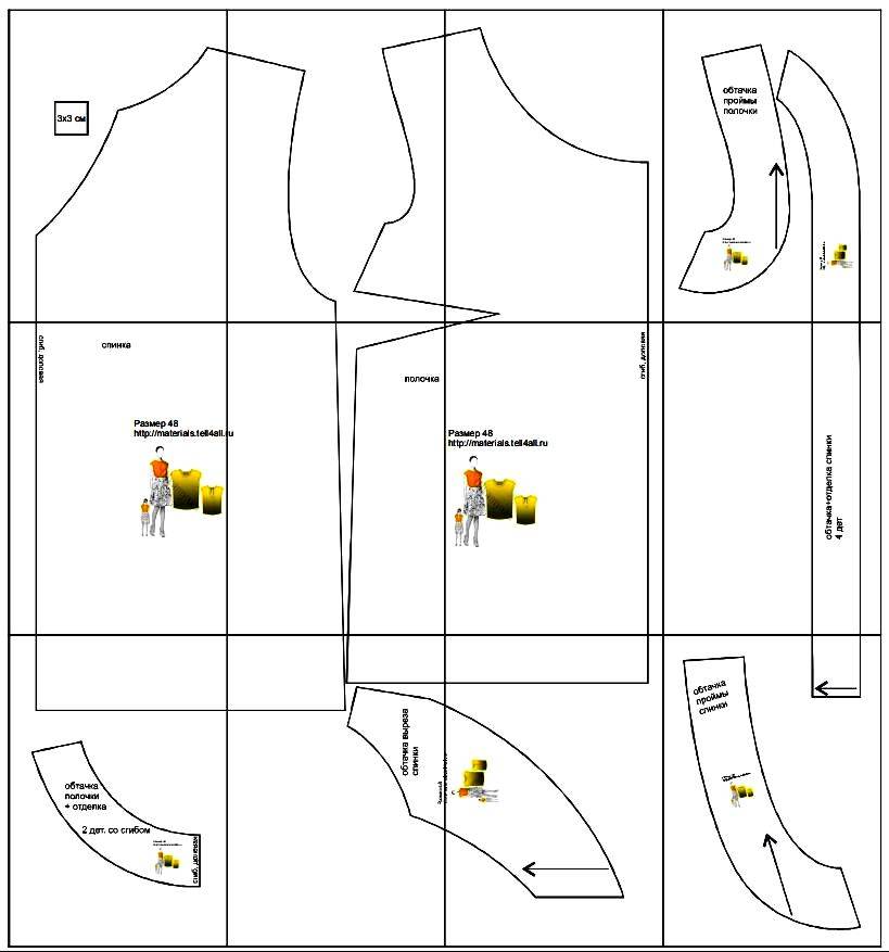 В качестве основы будем использовать выкройку топа со спущенным рукавом. Она выполнена на рост 168 см для следующих размеров:
