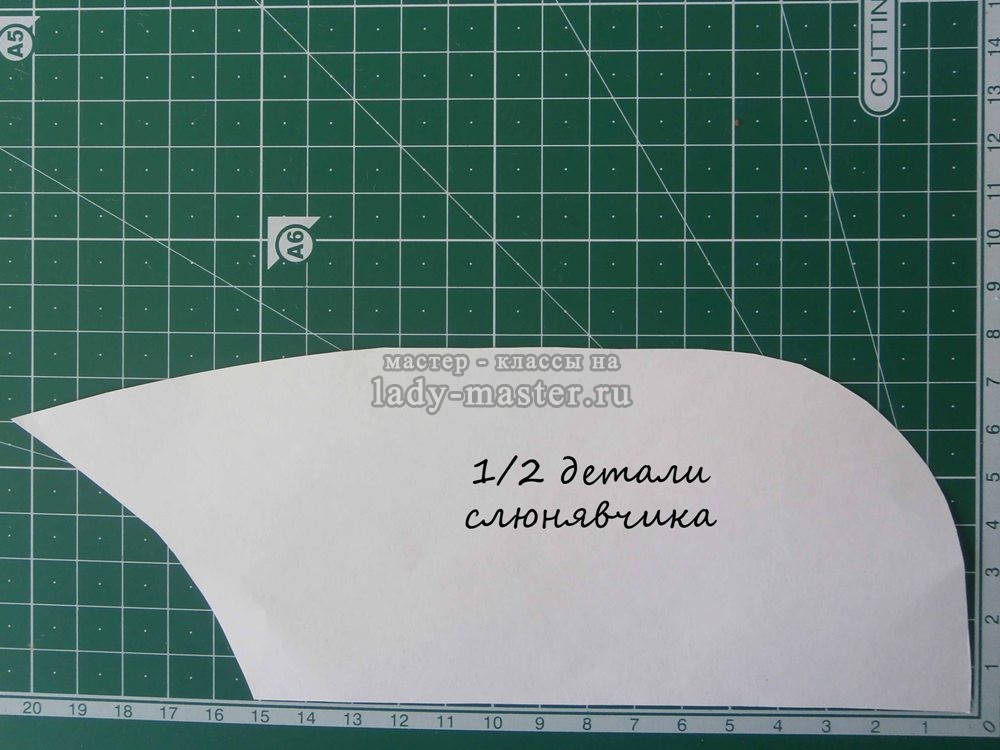 1. Сделаем выкройку на бумаге. Так как слюнявчик имеет симметричную форму, можно сделать только половину выкройки. Поэтому нарисуем половину слюнявчика и вырежем.