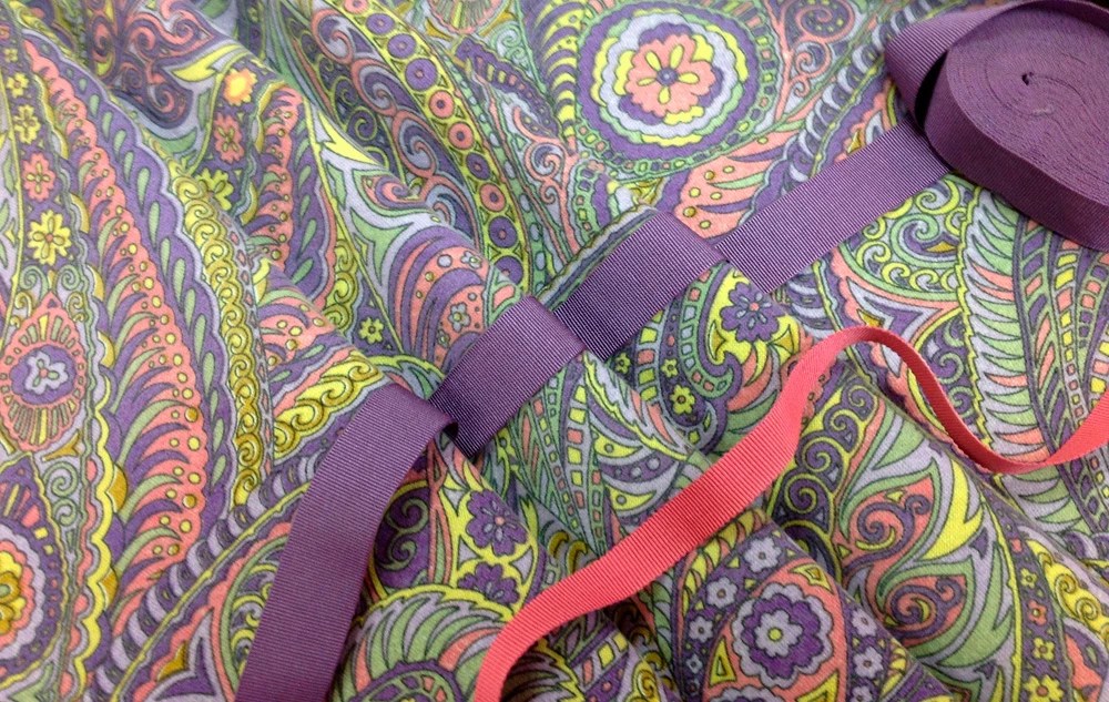 7. Из ткани в цветочек сделаем полоску для обработки края слюнявчика. Вырежем по косой несколько полосок и сошьем их, чтобы получилась одна полоска длиной примерно 100 см.