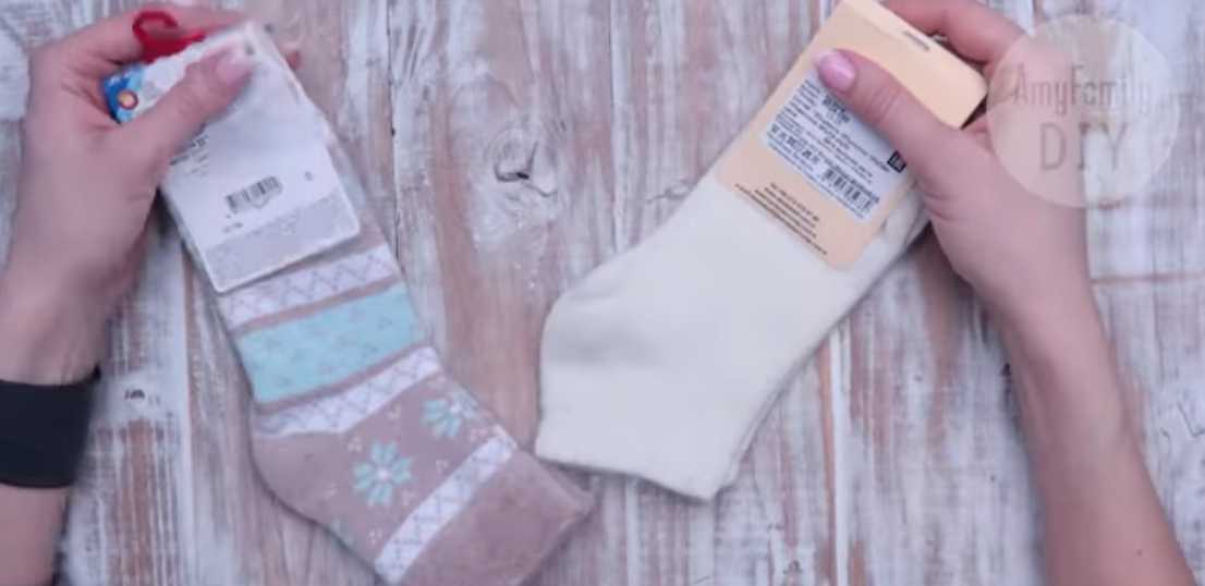 - Разрежьте белые носки на 3 части, убрав пятку, так, чтобы они у вас получились примерно одинаковыми по размеру.