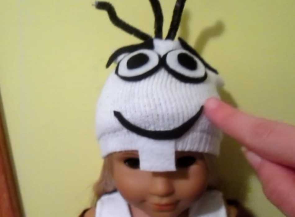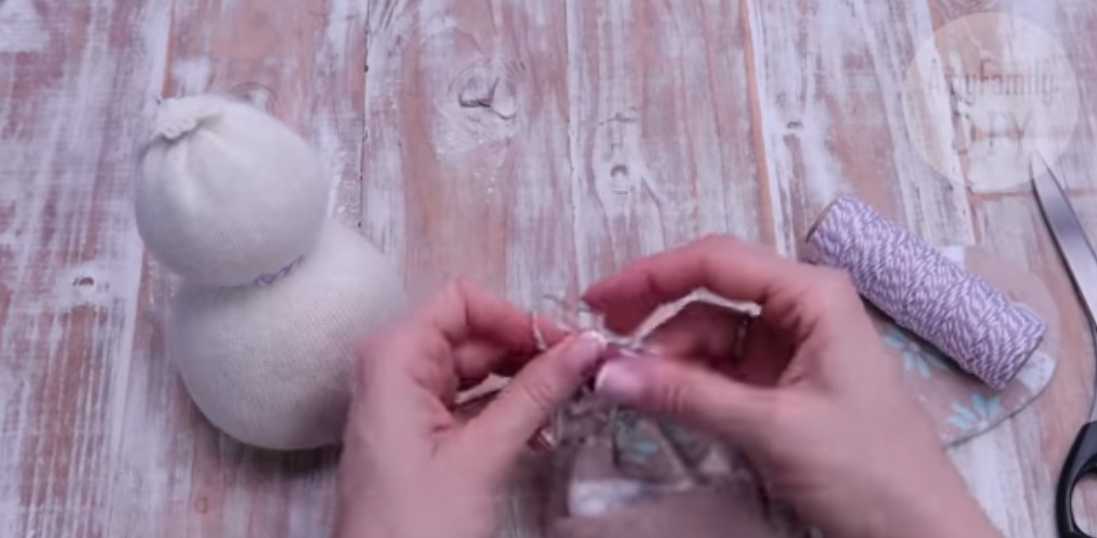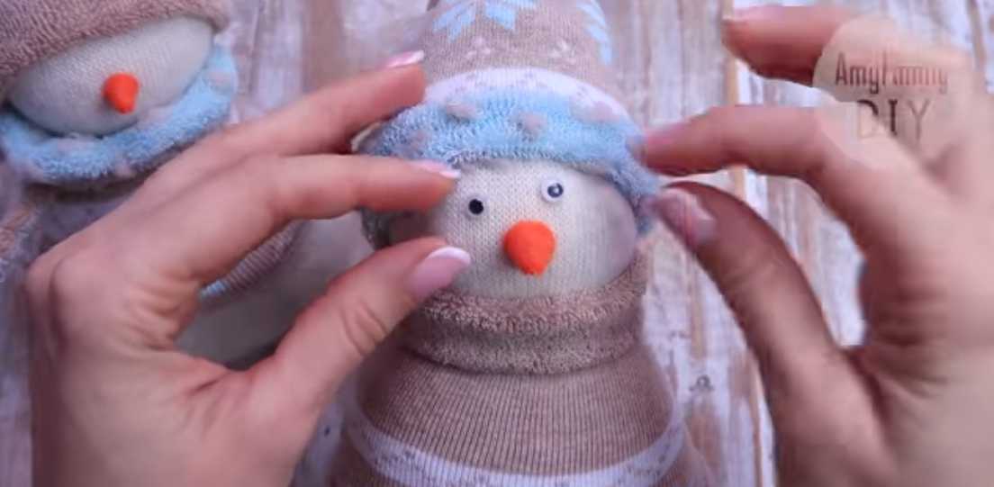 Теперь берем оставшуюся часть носка, связываем с одной стороны белой нитью и выворачиваем. Одеваем, получившуюся, шапочку на голову. Снеговик готов.