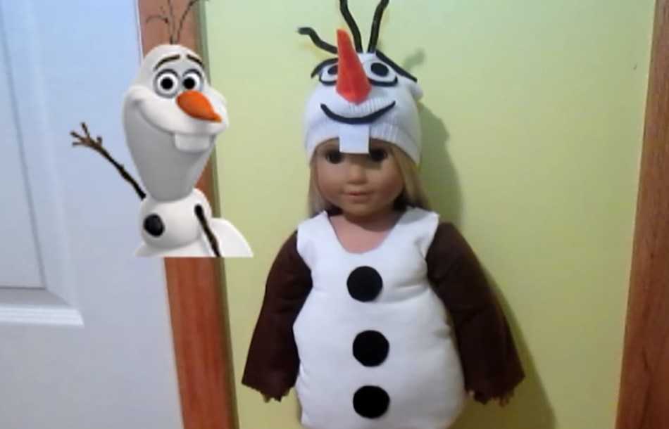 В нашем следующем мастер-классе костюм снеговика для мальчика шьют для куклы. Но он примечателен тем, что в нем есть схематическая выкройка. Если эту схему в несколько раз увеличить, то получится удачная выкройка костюма снеговика для мальчика или для девочки. Готовым этот кукольный предмет гардероба выглядит так, как на следующей модели.