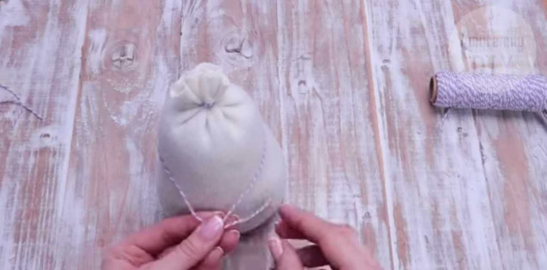 Заготовку из носка и риса аккуратно перетягиваем еще раз, чтобы отделить голову. Из бусин или пуговиц делаем глаза и нос. Их достаточно приклеить на клеевой пистолет. Рот можно нарисовать маркером или выложить из страз с клеевой подложкой. Ленту или отрез ткани обвязываем вокруг шеи.