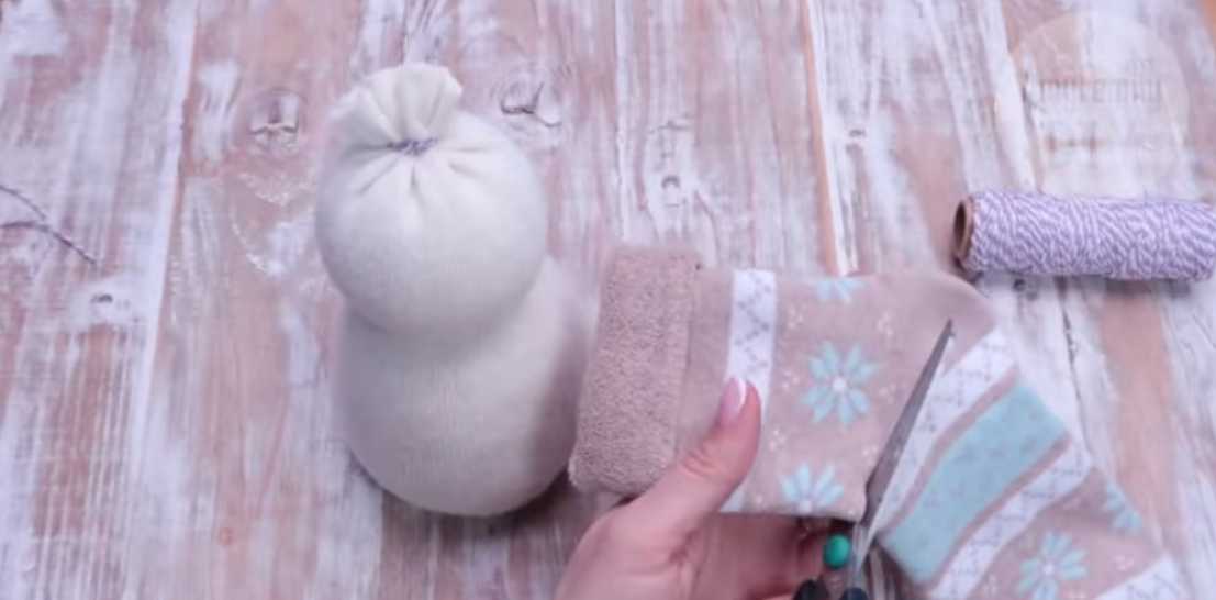 - На уровне шейки перевязываем прочной ниткой туловище, чтобы у снеговичка появилась голова. На шее завязываем яркий шарфик. На головку надеваем шапочку. Можно сделать из оставшейся части носка или связать с помпоном такую же, как шарфик. На средней линии туловища снеговика можно пришить две или три пуговички.