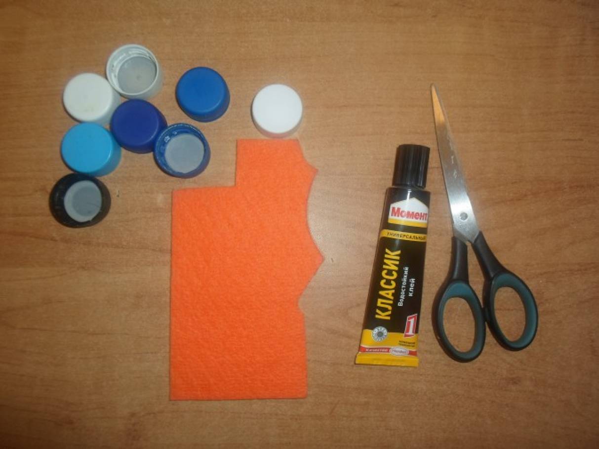 Для изготовления штампиков нам понадобятся простые и всем доступные материалы: ножницы, клей «Момент» водостойкий, универсальные салфетки и крышки от пластиковых бутылок.