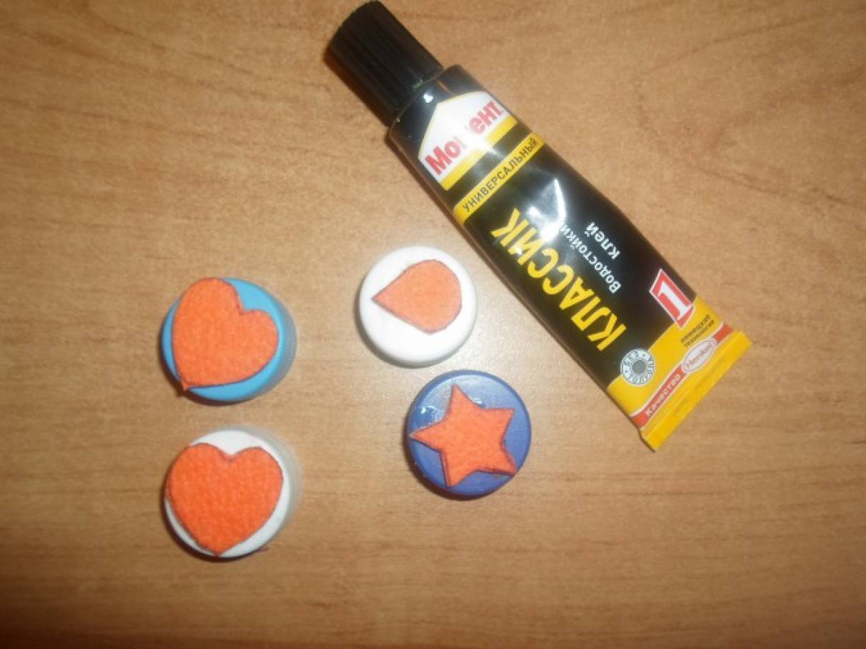 Фигурки приклеиваем клеем «Момент» водостойкий к крышкам.