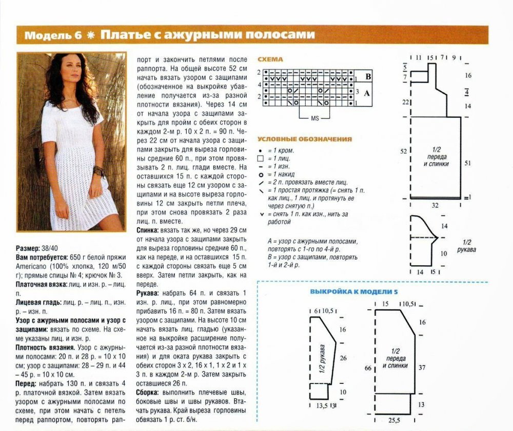 Простой А-силуэт, выполненный в смешанной технике – и на спицах, и крючком. Для работы понадобится 650-700 грамм белой пряжи, желательно стопроцентного хлопка, прямые спицы №4 и крючок №3. Лиф вяжется платочной вязкой, а так же узоры с ажурными полосами и защипами. Крючок понадобится для вывязывания раппортов.