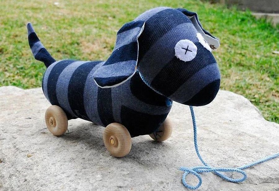 Чтобы ребенок мог прогуляться с игрушкой , к туловищу можно приделать колесики и к мордочке привязать веревочку, имитирующую поводок. Тогда щенок будет радостно бежать за вашим чадом.