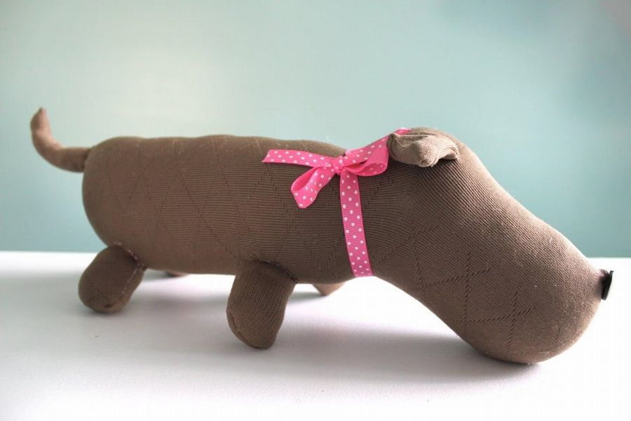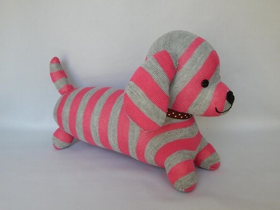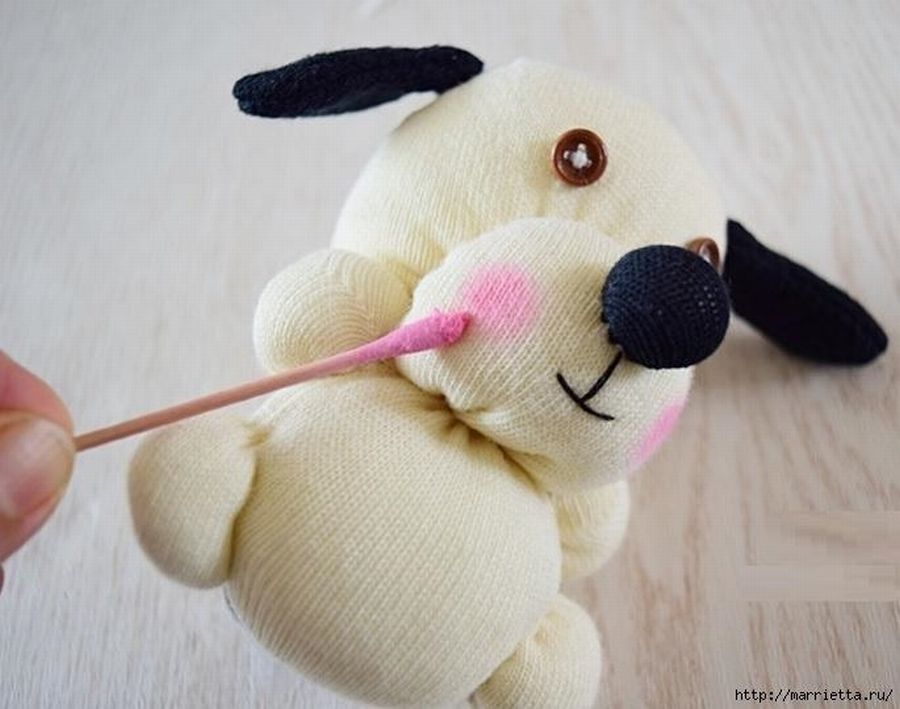 Сделать подобного красавца или красавицу не составит никакого труда даже ребенку под вашим чутким контролем. Для выполнения собаки из носка вам понадобится: носок, нитки в цвет носку, черные нитки, пара бусин (какого вы хотите цвета), наполнитель и ваша фантазия.