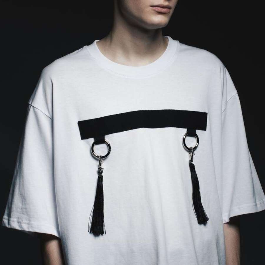 Аппликация из нейлоновой стропы с металлической фурнитурой рассчитана на людей с чувством юмора. Футболка унисекс и оверсайз.