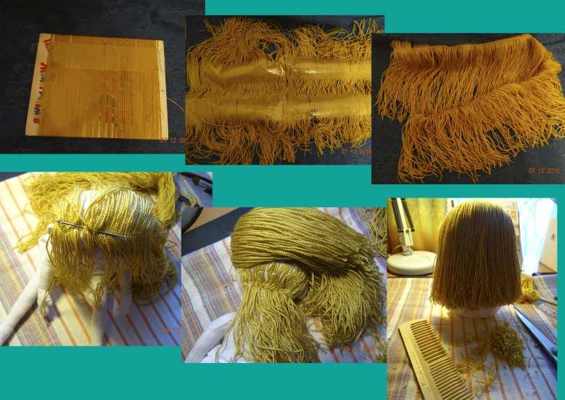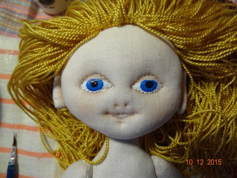 К готовой заготовке головы необходимо пришить волосы из пряжи. Нитку вдевают в иглу с широким ушком и изготавливают основу для причёски. По линии роста волос оставляют длинные концы, а затем делают три стежка швом вперёд иголку. Дойдя до макушки, нить возвращают назад и повторяют действие. По этой схеме покрывают пряжей всю голову. На готовую сетку наращивают пряди по всей голове. Стежки делают на расстоянии 4−5 мм друг от друга и закрепляют обратным стежком.