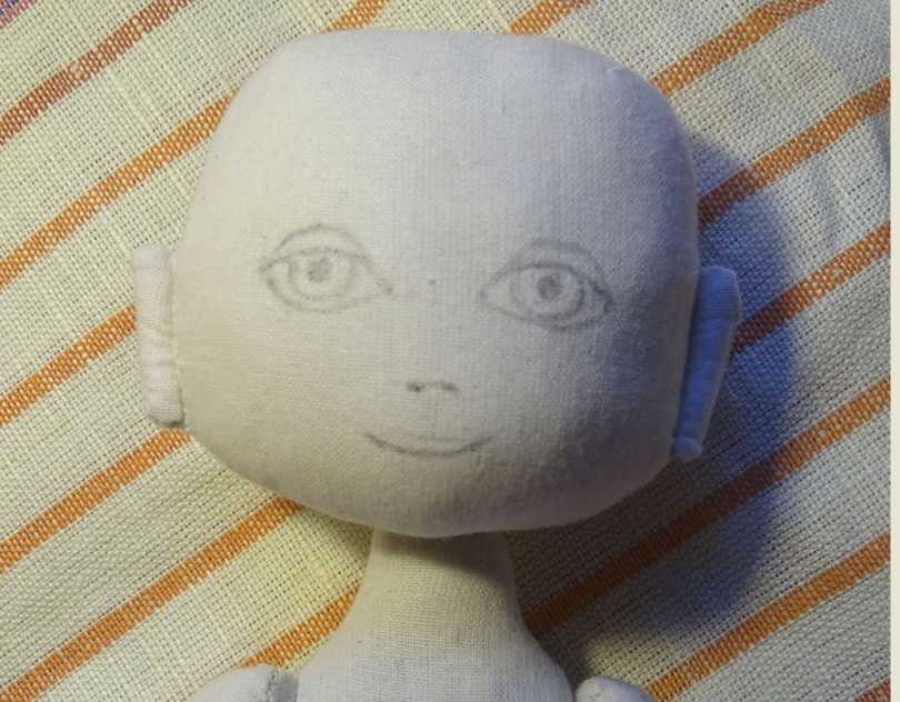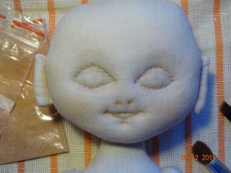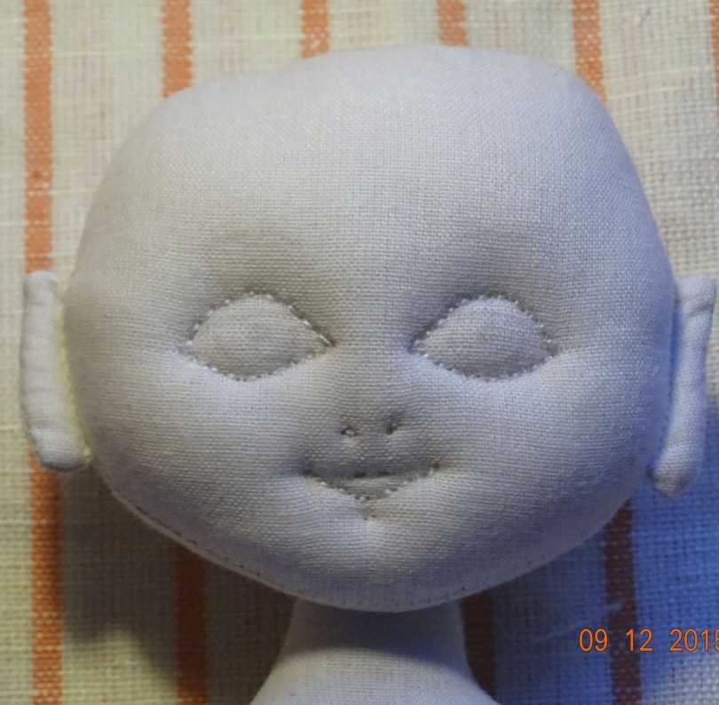 Точки расположения глаз и рта намечаются булавками. Нитки мулине вводят со стороны волос и вышивают глаза и ротик.
