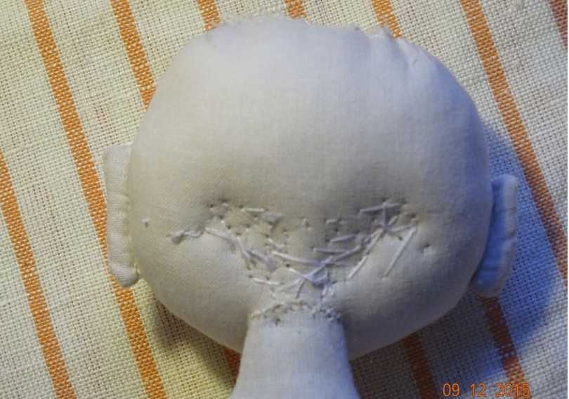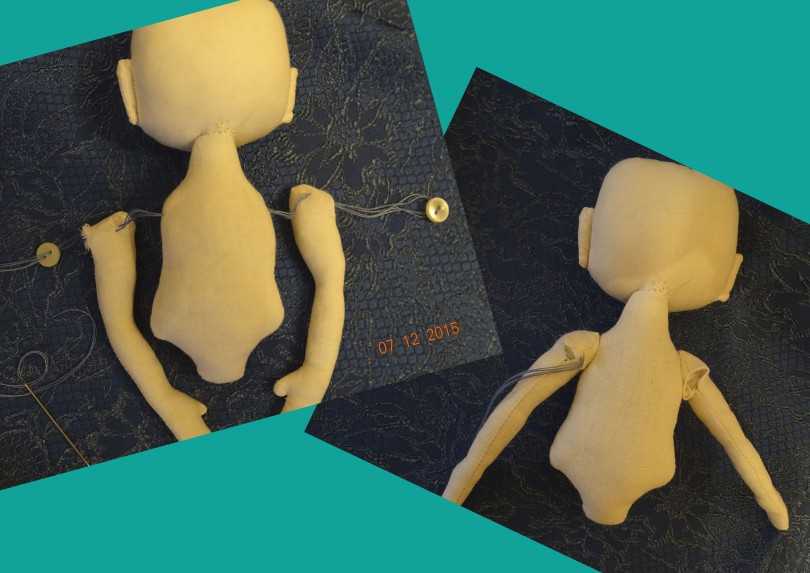 Детали рук и туловища сшивают и выворачивают. Набитые руки соединяют с заготовкой головы булавками. Руки сводят перед лицом, проверяя их правильное расположение. После проверки руки пришивают и стягивают на спинке дополнительным швом.