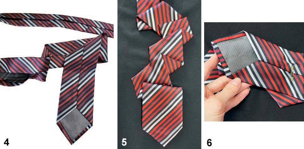 Выложить галстук на изделии, образуя косые неравномерные складки (5). Рекомендуется начинать снизу, с широкого конца галстука, а заканчивать у горловины основного изделия, где можно скорректировать длину галстука. Зафиксировать складки булавками без соединения с изделием.