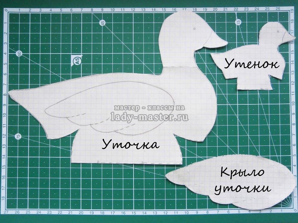 1. Нарисуем на бумаге уточку, крыло уточки и утенка. Их можно перерисовать по клеточкам (1 клетка=1 см) или обвести по фотографии, приложив тонкий лист бумаги к экрану монитора.