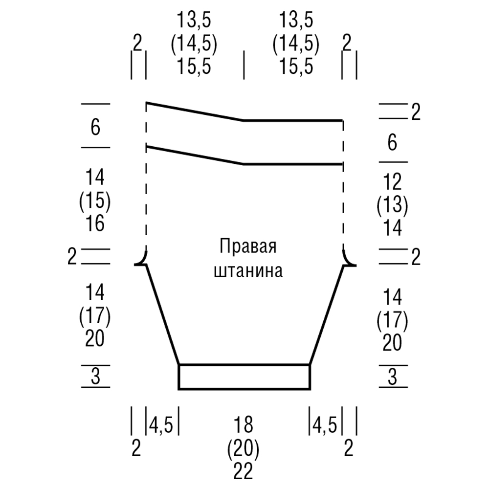 Через 14 (17) 20 см от планки временно оставить все петли, при этом отметить середину правой штанины.