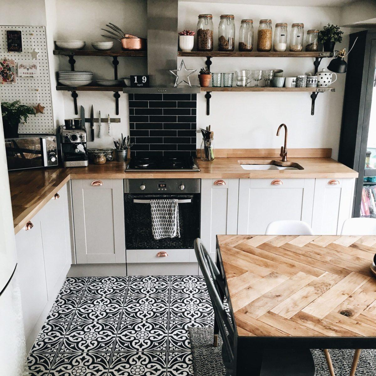 Стиль приветствует замену верхних шкафов открытыми полками, на которых размещаются посуда, баночки со специями и чаем, предметы декора. Но в тесной кухне такое обилие деталей может перегружать интерьер, и в этом случае лучше остановиться на традиционных навесных шкафах. Более подробно читайте в статье про дизайн кухни без верхних шкафов.