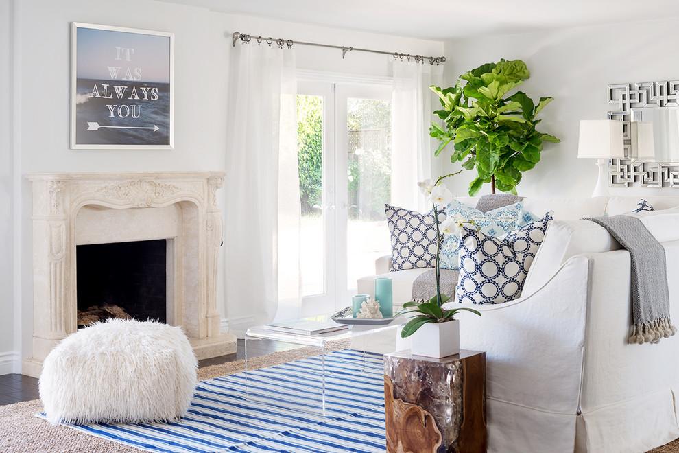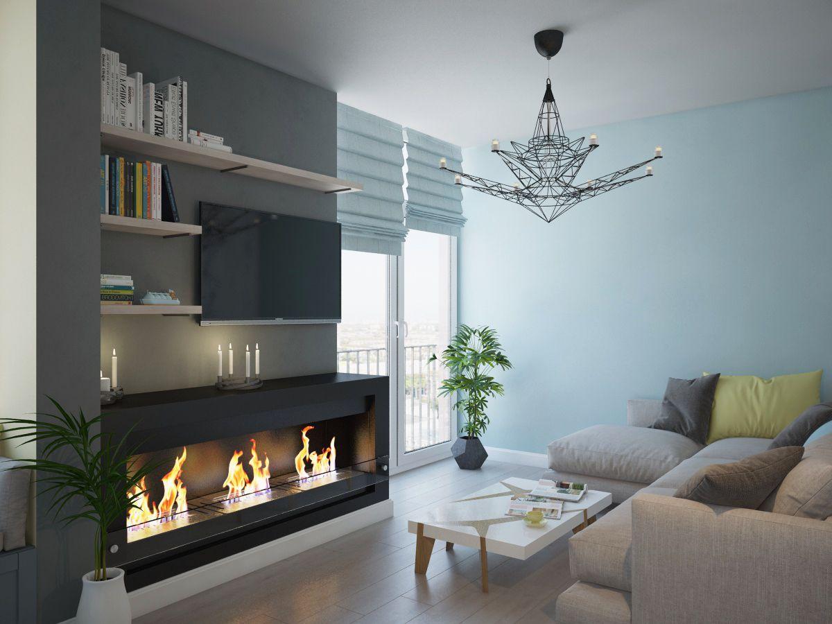 Главные компоненты зала — камин или биокамин, мягкий диван, журнальный столик. Но не стоит забывать и про функциональное назначение комнаты: организуйте удобное хранение с помощью стеллажей, шкафов, плетеных коробок и корзин. Можно задействовать подоконник, разместив на нем несколько удобных подушек.