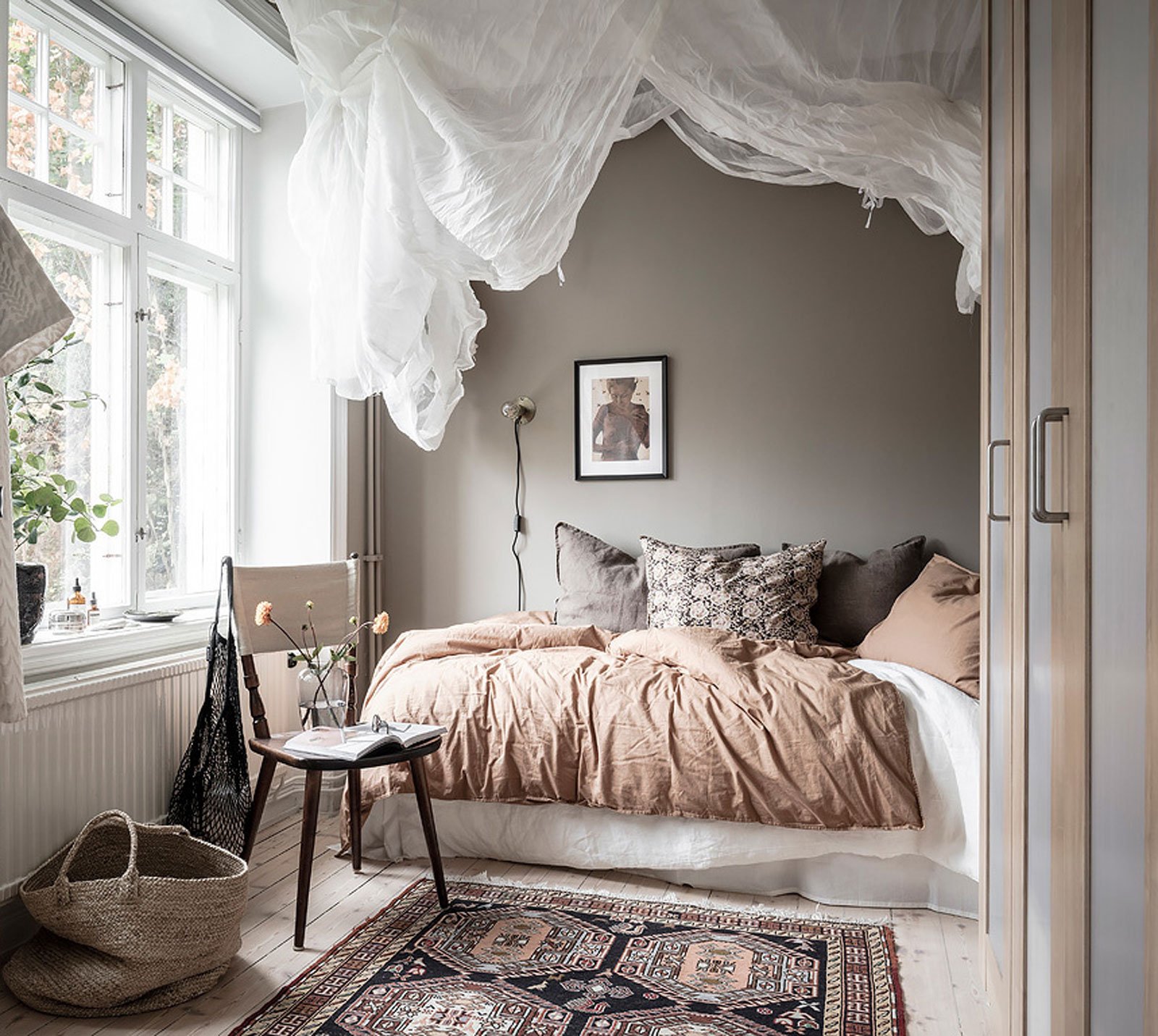 Для стиля Хюгге ничего не стоит вписать кровать вплотную к окну, чтобы просыпаться вместе с солнечными лучами на лице, а в случае чего на окнах есть плотные римские шторы