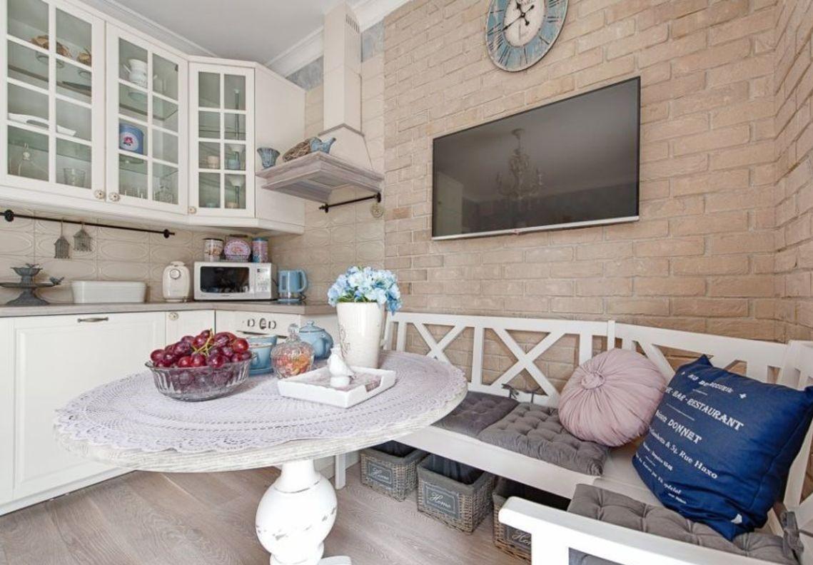 Если позволяет место, можно установить в обеденной зоне маленький диван; в ином случае на стульях размещаются декоративные подушки, чтобы сиденья получились мягкими. Фартук можно сделать керамическим, выложить декоративным кирпичом или камнем либо покрасить грифельной краской.