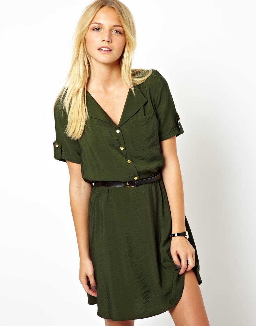 Если девушка не боится смелых сочетаний, то может поэкспериментировать с расцветкой милитари. Она актуальна в новом модном сезоне. Практичное пальто-милитари идеально сочетается с платьем-сафари.