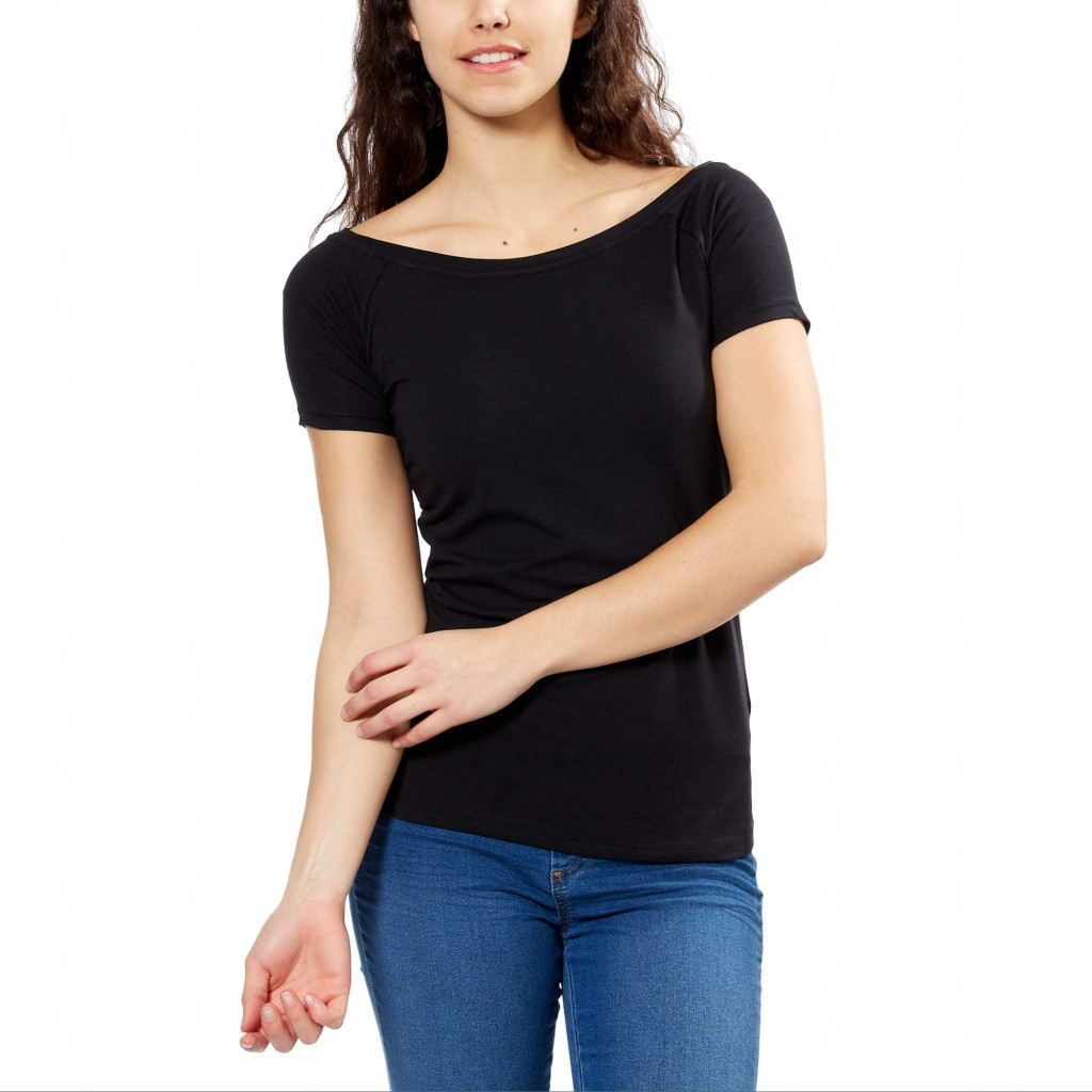 Футболка с приспущенной линией плеча. Подобными моделями была отмечена весенне-летняя коллекция Донны Каран. Благодаря необычному крою и свободному силуэту такая вещь выглядит довольно строго и элегантно, ее стоит носить зрелым женщинам в сочетаниях со строгими брюками и юбками.