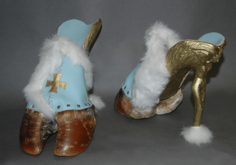 Странная обувь создается немецким дизайнером Ирис Шеферштейн, которая использует кости и другие элементы тел мертвых животных. Подходящим материалом служат лошадиные копыта, змеиная кожа, целые тушки убитых птиц. Несмотря на высокую стоимость, долго носить подобные модели невозможно, ноги будут сильно болеть.
